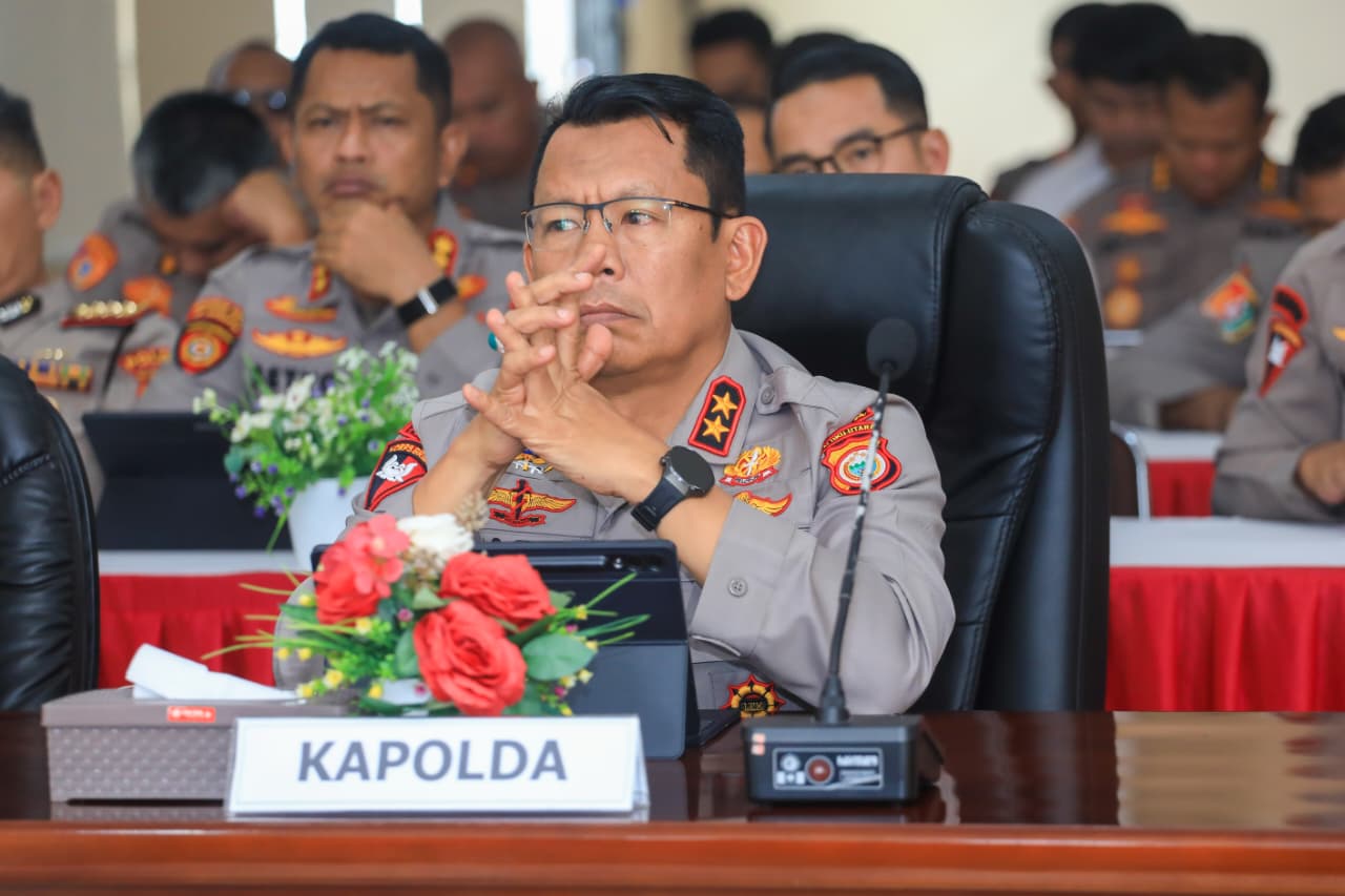 HUMAS POLDA MALUT – Kapolda Maluku Utara Irjen Pol. Drs. Waris Agono, M.Si., bersama Wakapolda menghadiri arahan Wakapolri dalam rangka analisis dan evaluasi (anev) perkembangan situasi keamanan dan ketertiban masyarakat (sitkamtibmas) terkini, Senin (23/2/2026). bertempat di Lantai 3 Gedung Hoegeng Iman Santoso Polda Malut.