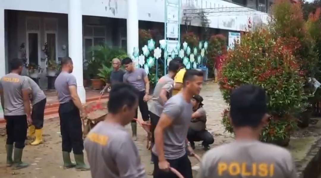 Sebagai bentuk kepedulian dan respons cepat terhadap kondisi tersebut, pada Senin (29/12/2025) personel Polres Langsa turun langsung ke lokasi memulai pembersihan. Dengan peralatan sederhana seperti cangkul, sekop, dan kereta dorong, personel Polri bersama para guru bergotong royong membersihkan lumpur di halaman dan ruang kelas agar sarana pendidikan dapat segera difungsikan kembali.