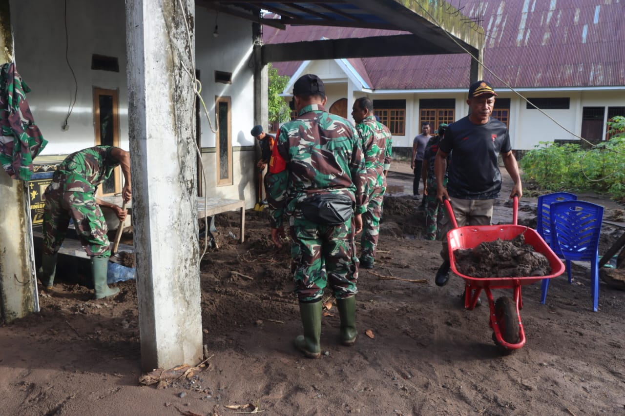 HUMAS POLDA MALUT – Personel gabungan TNI, Polri, dan Satuan Polisi Pamong Praja (Pol PP) yang tergabung dalam tim penanggulangan bencana Kabupaten Halmahera Utara melaksanakan pembersihan material banjir pascabencana di Desa Doitia, Kabupaten Halmahera Utara, Malut, Minggu (11/1/2026).